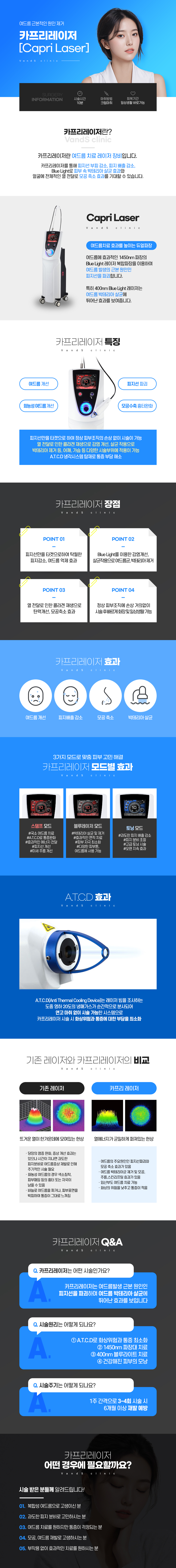 카프리 레이저는 여드름에 효과적인 1450nm 다이오드 레이저와400nm 파장의 블루라이트 레이저 복합 파장을 이용하여 여드름의 근복적인 원인인 피지선을 파괴 효과를 기대할 수 있습니다.